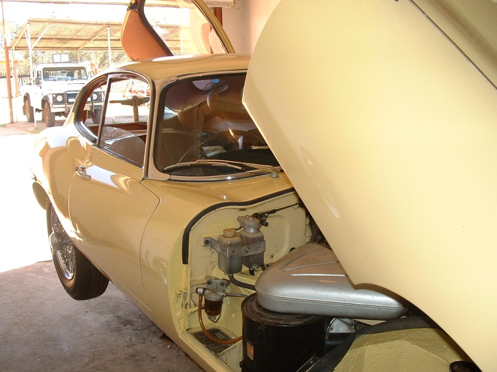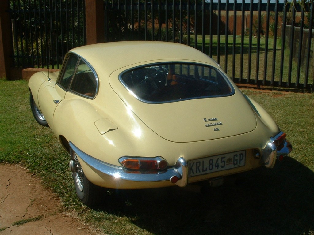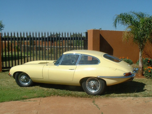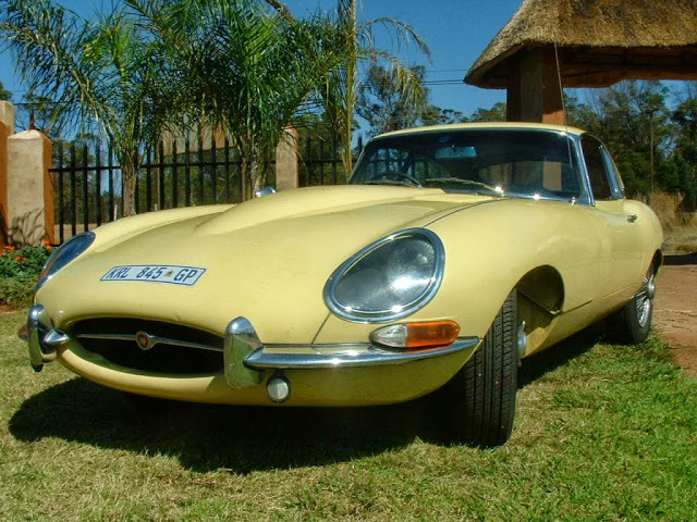 Near-original 1966 Jaguar E-type coupe, manual, 2-seater, Primrose Yellow with Tan interior, chrome wire spoke wheels in my collection. Painted in a bright yellow, it is the same colour as the E described by British comedian Charlie Drake as "my custard torpedo". This car brought definition to the word "patina" -- its un-restored, original interior is just as it was 50 years ago.
